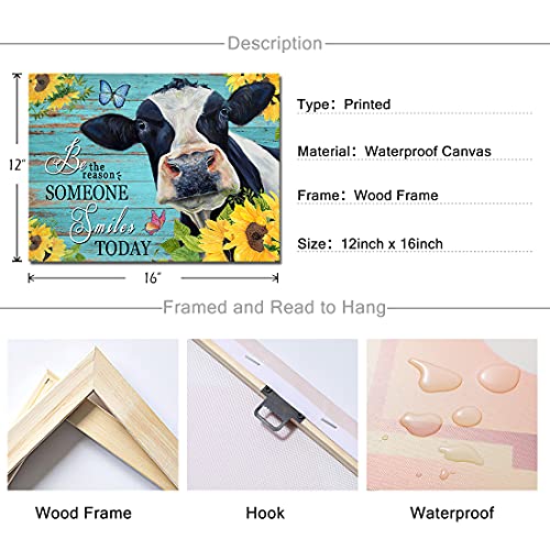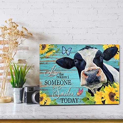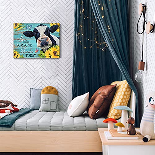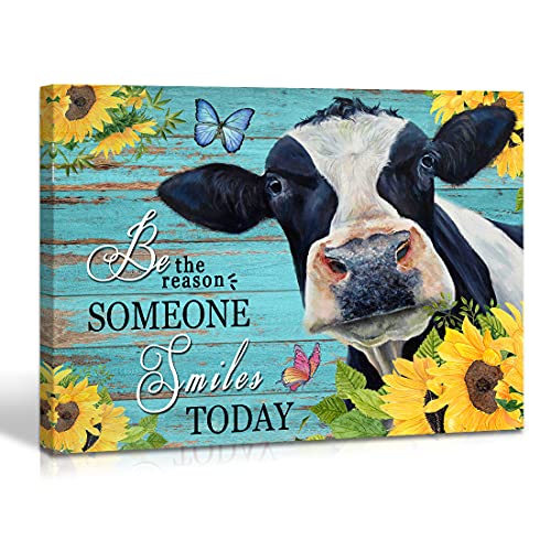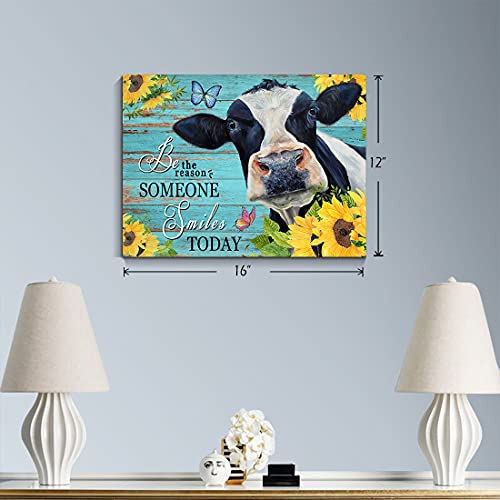 WOWGOOMO - لوحة جدارية من كيوت، كانفاس برينت للحمام وغرفة النوم والمطبخ والمكتب، تصميم بقرة مع زهور عباد الشمس باللون التيل الأزرق والأصفر، مقاس 30.48 × 40.64 سم