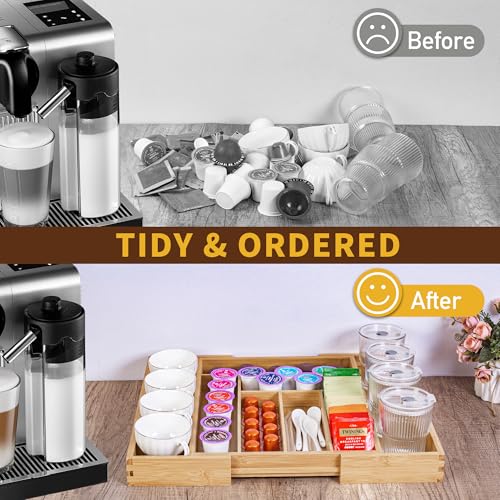 - 【مساحة تخزين وفيرة】 يحتوي منظم القهوة والشاي على 6 أقسام وقسمين كبيرين قابلين للتوسع لتخزين كبسولات كيه كب وكبسولات نسبريسو وكبسولات فيرتو وأكياس الشاي. يستوعب ما يصل إلى 45 كبسولة كيه كب، مما يستغل مساحة المكتب بأفضل شكل مع الحفاظ على ترتيبها.