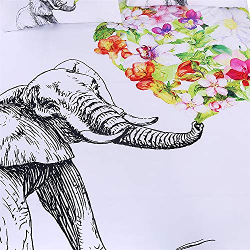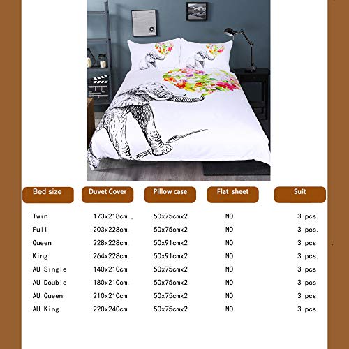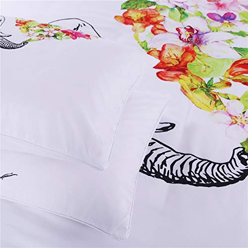QXbecky - طقم سرير مطبوع عليه زهور فيل من 3 قطع على أبيض. غطاء لحاف منفوش مع غطاء وسادة. مايكروفايبر سهل العناية. متعدد المقاسات 173 سم × 218 سم، Full