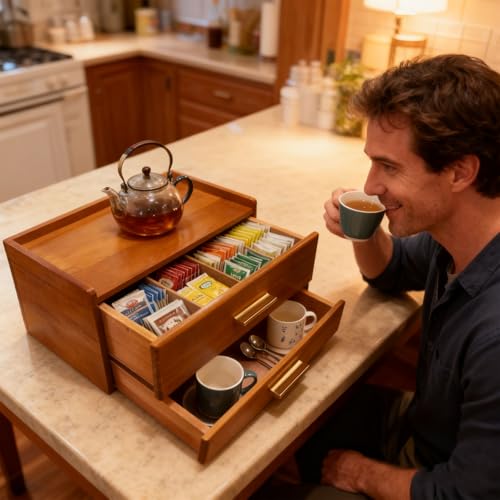 - 【هيكل فاخر من خشب الأكاسيا】 مصنوع من خشب الأكاسيا عالي الجودة، يتميز منظم أكياس الشاي الخشبي هذا بحبيبات أنيقة بشكل طبيعي ومقابض أدراج ذهبية متطورة. هيكله المتين والأنيق يجعله ليس فقط صندوق تخزين منظم لعلبة الشاي ولكنه أيضًا إضافة لا تتأثر بمرور الزمن إلى محطة الشاي الخاصة بك. يضمن اللمسة النهائية الناعمة والهيكل المتين استخدامها كعلبة شاي ومنظم حامل شاي موثوق به لسنوات