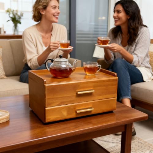 QYLZ - منظم اكياس الشاي الخشبي من كيو واي ال زد، صندوق تخزين من خشب الاكاسيا مع درج، صناديق حاوية حامل اكياس الشاي لسطح الطاولة، عرض صندوق الشاي