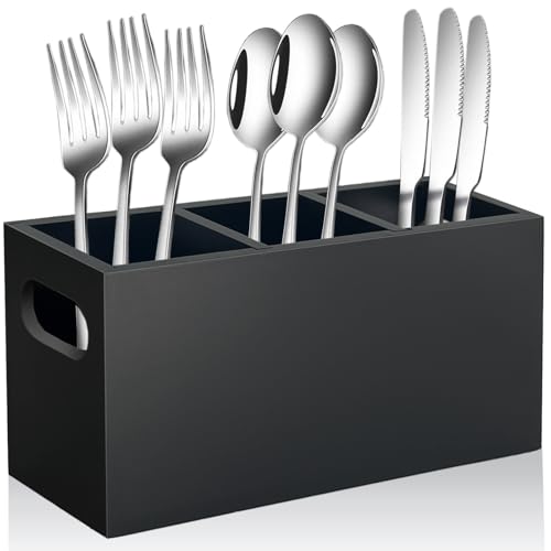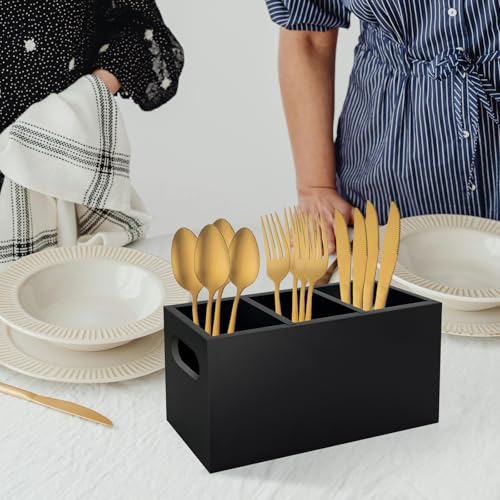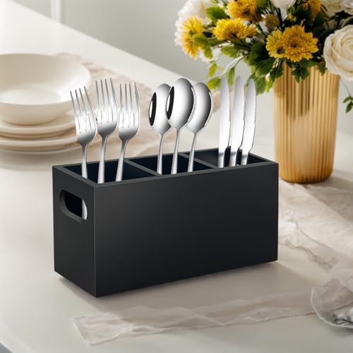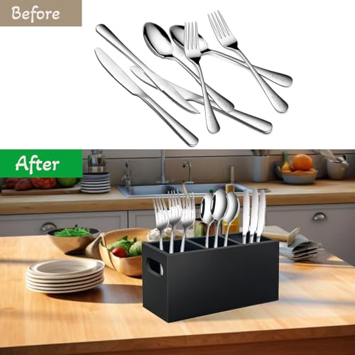 - منظم أدوات المطبخ الخشبي الجميل: علبة أدوات المائدة مصنوعة من خشب عالي الجودة قوي ومتين بتصميم بسيط، منظم صغير مقاس 23 سم × 9 سم × 12 سم يحتوي على ثلاث مساحات تخزين لحمل كمية كبيرة من أدوات المائدة والفضيات.