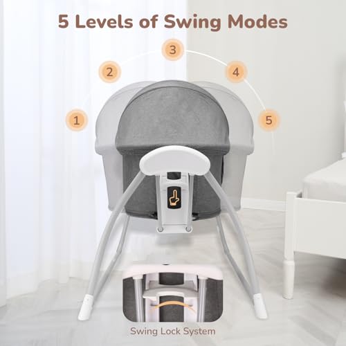 - خيارات عداد الوقت ونظام قفل الهز: حدد مدة الهز المثالية باستخدام عداد الوقت الذكي لمدة 15 و30 و60 دقيقة مع 5 مستويات لضبط السرعة، مما يتيح لك تخصيص روتين نوم طفلك. اجعل سرير طفلك ثابتًا في أي وقت بفضل نظام قفل الهز الذكي.