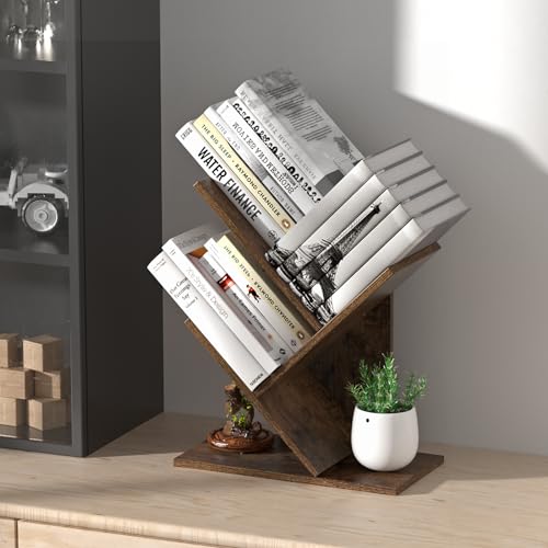 R RUISHENG - رف كتب بتصميم شجرة صغيرة مكون من 3 طبقات من ار رويشينج، منظم كتب ضيق للكتب والمجلات والاقراص المضغوطة، ارفف تخزين خشبية رترو للمنزل والمكتب وغرفة النوم وغرفة المعيشة، بني ريفي