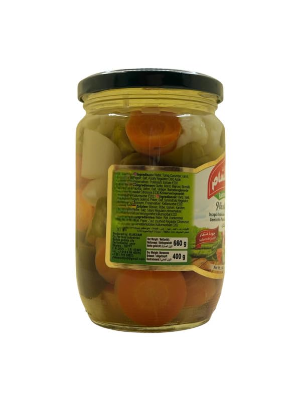 - مزيج شهي من الخضروات المخللة: مزيج مثالي يقدم تناغماً رائعاً من النكهات الغنية والمميزة التي تضيف لمسة لذيذة وشهية إلى وجباتك اليومية.