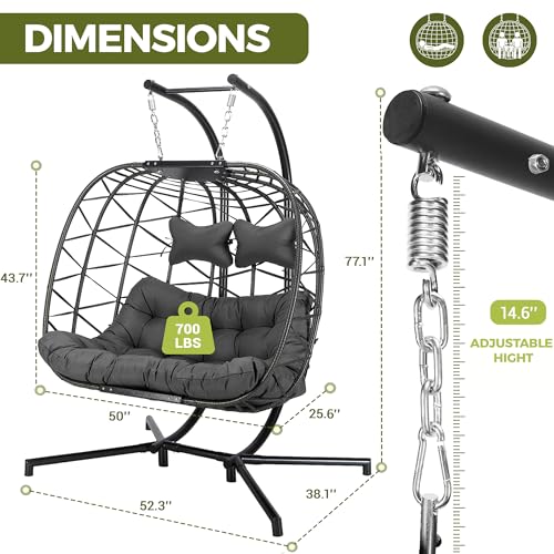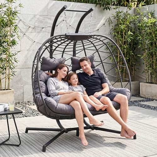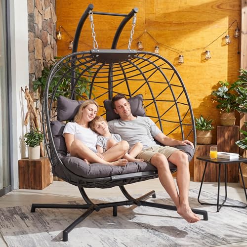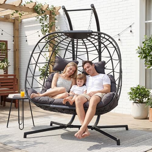 RADIATA - كرسي ارجوحة بيضة لشخصين من رادياتا بحجم كبير، كرسي بيضة من الخيزران شديد التحمل 700 باوند مع حامل للخارج، مقعد مريح مع وسادة سميكة للشرفة والفناء، رمادي داكن