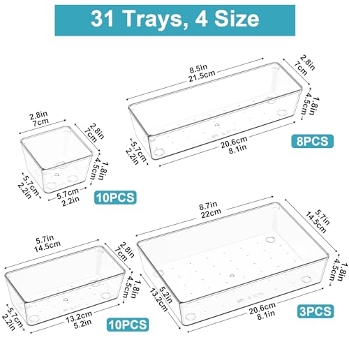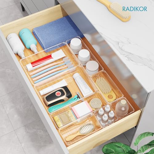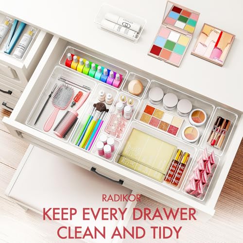 Radikor - منظم ادراج 31 قطعة من راديكور، ادراج لتنظيم المكياج من البلاستيك الشفاف، صندوق تخزين للحمام بـ 4 احجام، ادراج تخزين للحمام والمطبخ والمكياج والمكتب