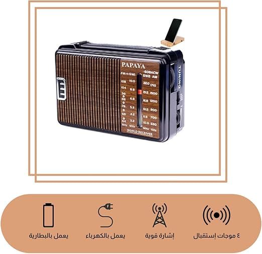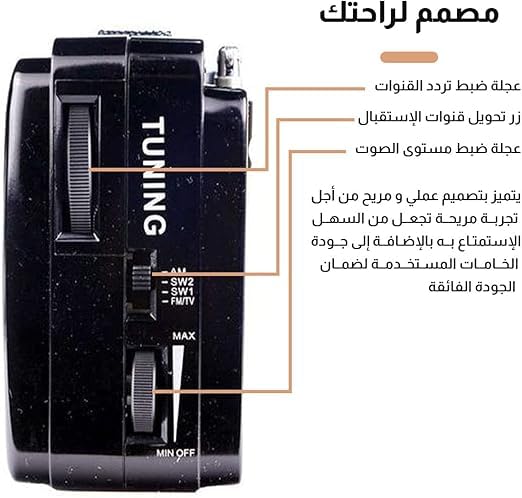 - مستقبل راديو متعدد الاستخدامات: استمتع بعالم من الترفيه مع الراديو متعدد الاستخدامات الذي يدعم نطاقات ايه ام واف ام والتلفزيون واس دبليو 1 واس دبليو 2. سواء كنت تستمع إلى محطة الموسيقى المفضلة لديك أو تلتقط آخر الأخبار أو تستكشف البث الدولي، فإن هذا الراديو يلبي احتياجاتك.