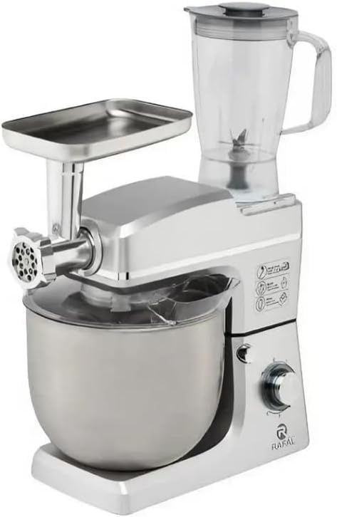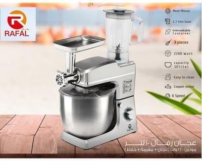 Generic - Rafal عجانة كهربائية 3 في 1، 2200 واط، وعاء 10 لتر، 6 سرعات، مع مفرمة لحم وخلاط، فضي