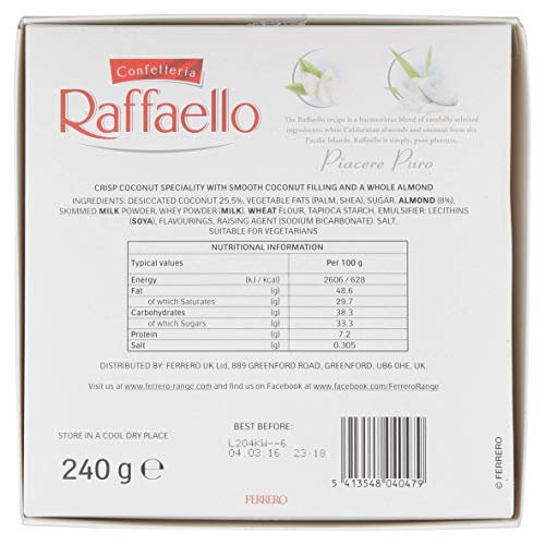 - 3 قطع بوزن 240 جم لكل علبة شوكولاتة رافايلو.