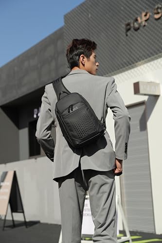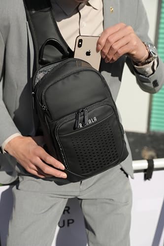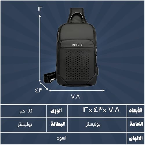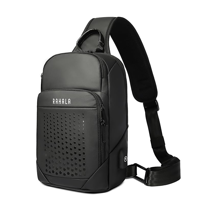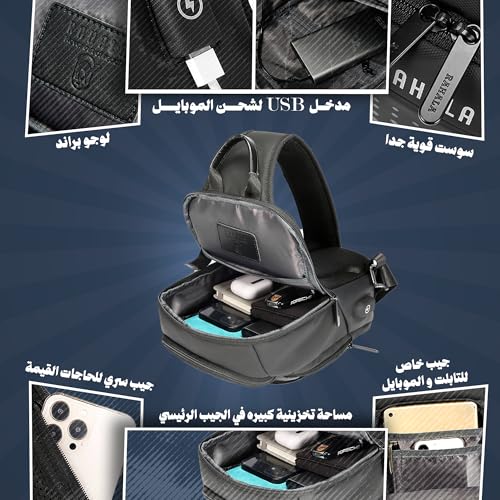 Rahala - رحالا شنطة ظهر بحزام طويل تمر بالجسم للرجال جانبية متعددة الجيوب صدر للاستخدام اليومي مقاومة للماء كتف واحدة فاخرة للمكتب والاعمال منفذ USB BNG129 اسود