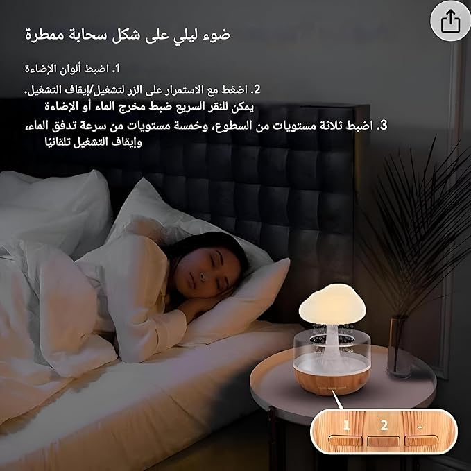 • تصميم فريد على شكل سحابة ممطرة: جهاز ترطيب الهواء بتصميم عصري وجذاب يضيف لمسة جمالية لأي غرفة في منزلك