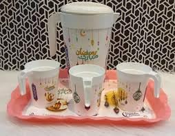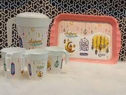 - طقم رمضاني متكامل: يتضمن إبريق للمشروبات، أكواب للتقديم، وصينية تقديم أنيقة مزينة بزخارف رمضانية تقليدية