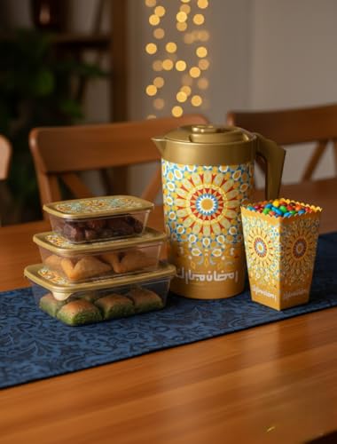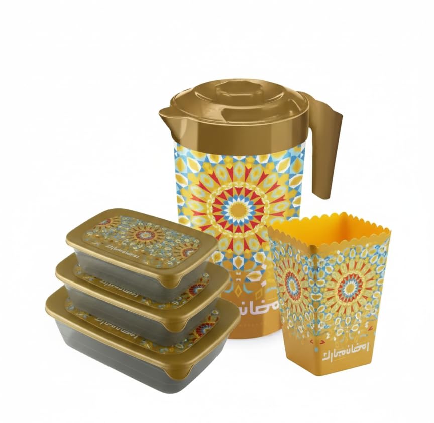 - حزمة رمضان كاملة: تتضمن هذه المجموعة المكونة من 5 قطع 3 حاويات تخزين للثلاجة (900 مل، 1.5 لتر، 3 لتر)، إبريق عصير 1.8 لتر، وصندوق فشار 2.2 لتر، جميعها تتميز بتصميم رمضان جميل مطابق مع أنماط زخرفية