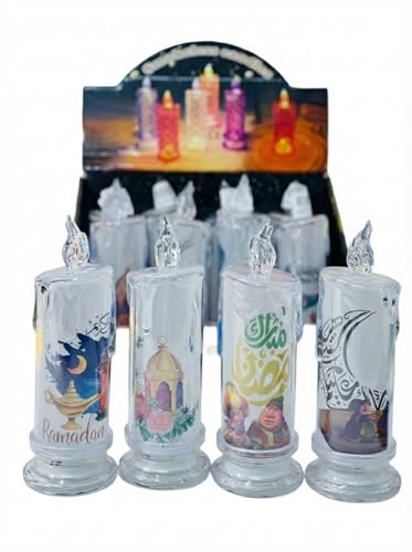 - إضاءة ساحرة: جسم الشمعة الشفاف مع "الجليتر" الداخلي يعطي توهجاً رائعاً في الظلام. تنوع الرسومات: يأتي برسومات مختلفة (بكار، فنانيس، هلال ومسجد، وعبارات رمضان كريم) لترضي جميع الأذواق.