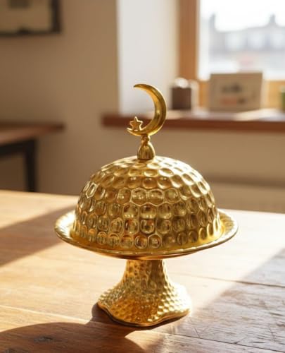 Generic - تمرية بغطاء قبة مع زينة غزال أو هلال، أبيض وذهبي، 23×18 سم، لتقديم التمر والحلويات في رمضان (ذهبي)