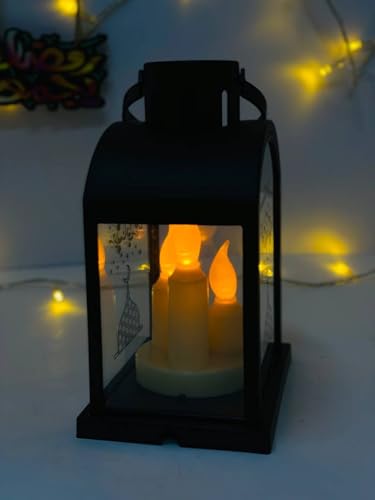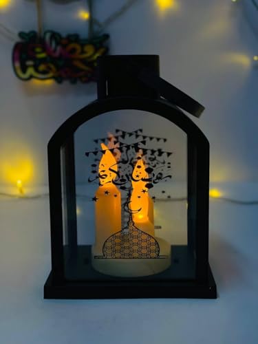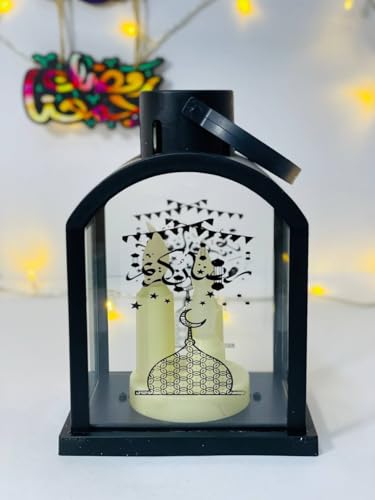 Generic - فانوس رمضان ديكور، أسود مع تصميم مسجد وهلال، 3شمعة LED، للزينة الرمضانية مقاس 19سم