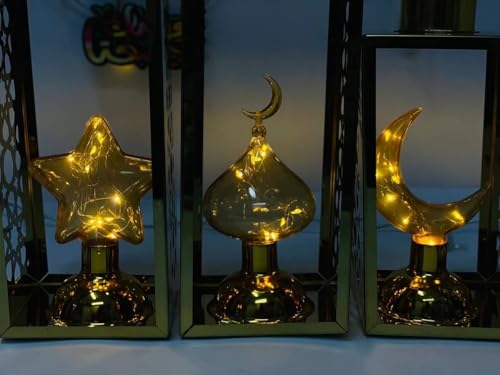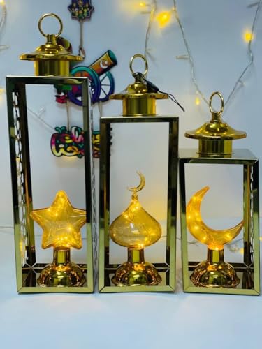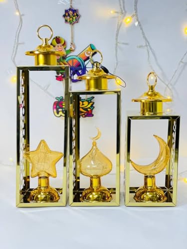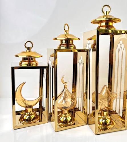 Generic - طقم فوانيس رمضانية ديكور 3 قطع، معدن مطلي ذهبي، تصميم الهلال والنجمة والقبة، 39 و34 و29 سم لأجواء رمضان 2026