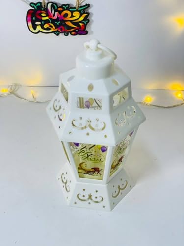 Generic - فانوس رمضان للديكور، ابيض مع خط عربي، اضاءة LED، موضوع احتفالي مع بالونات