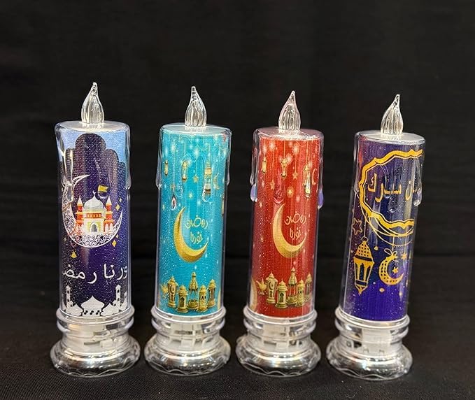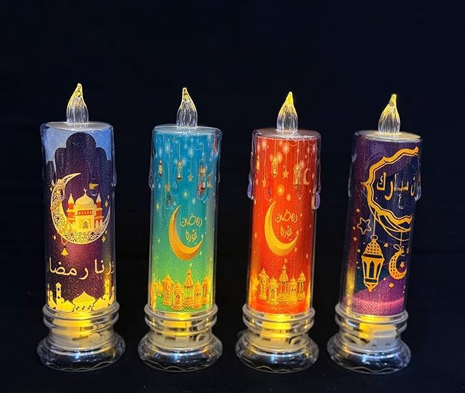- شموع LED مزخرفة: مجموعة من 4 شموع LED بتصميم إسلامي لرمضان مع قمر وفانوس ومسجد ونص عربي بألوان نابضة بالحياة