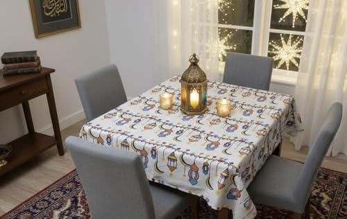 Generic - مفرش طاولة رمضان بتصميم إسلامي احتفالي من مزيج الكتان والقطن مقاس 1.5 × 1.5 م قابل للغسل مناسب للإفطار والسحور، تصميم فوانيس ملونة