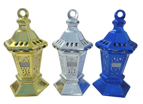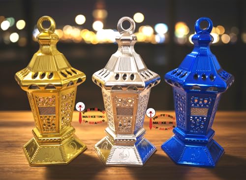 Generic - فانوس زينة مضئ واغنية رمضان جانا ، تصميم سداسي مزخرف، متوفر بثلاثة ألوان (ذهبي، فضي، أزرق)، ارتفاع 25 سم، ديكور رمضاني (ذهبي)