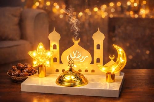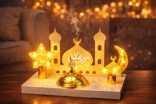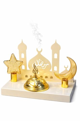 Generic - مبخرة رمضان متوهجة، مبخرة معدنية بالكامل تعرض هلال ونجمة زجاج مضيئة ينبعث منها دخان عطري وضوء ناعم، مبخرة لإضفاء أجواء مميزة على أمسيات وتجمعات رمضان