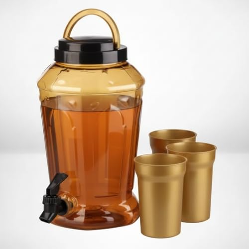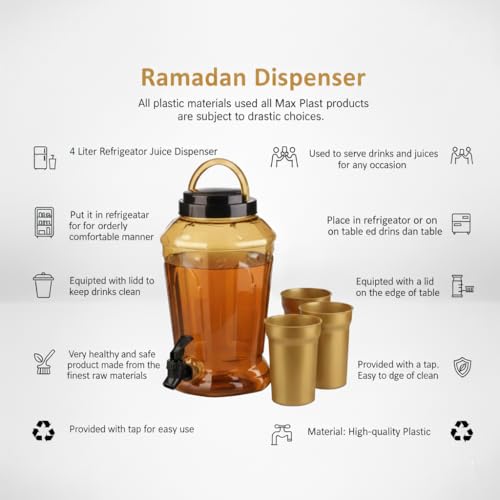 Max Plast - موزع عصير من البلاستيك مزود بحنفية ومقبض ذهبي مع 3 أكواب لشهر رمضان، لون بني فاتح(Amber)، سعة 4 لتر