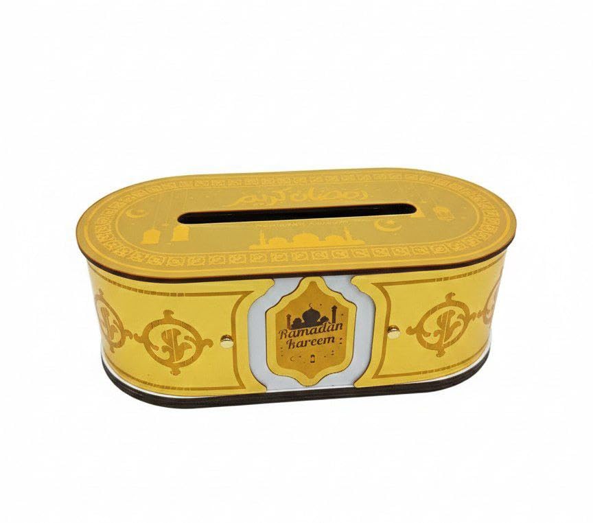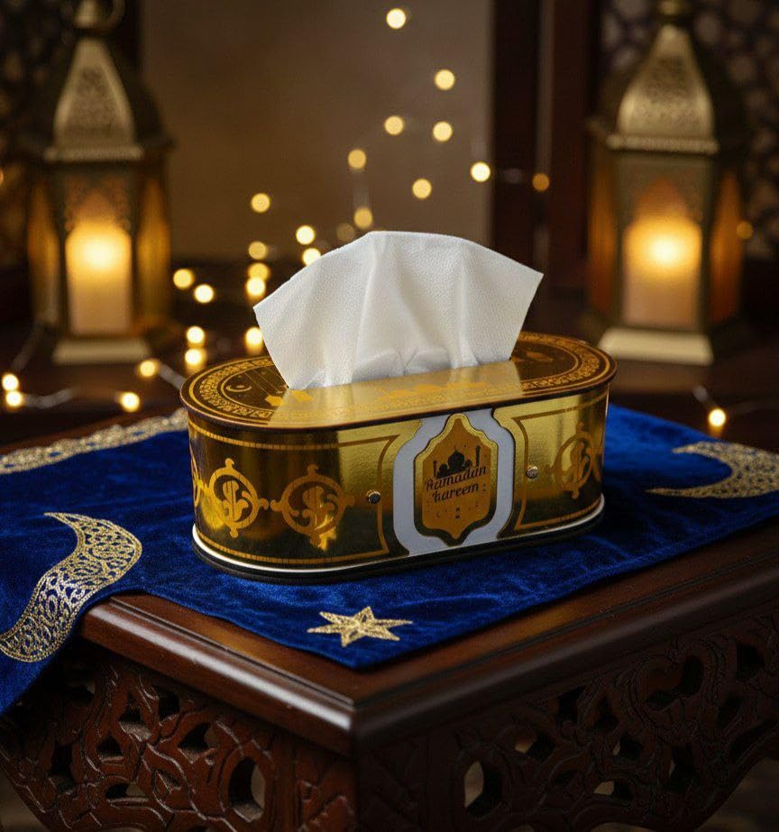 - تصميم مزخرف: حامل علبة مناديل أنيق بيضاوي الشكل يتميز بأنماط إسلامية ذهبية وسوداء مزخرفة مع علامة "رمضان كريم"، مثالي لإضافة سحر احتفالي إلى منزلك خلال الشهر الكريم