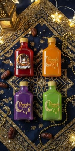 - تصميم جذاب: زجاجات شفافة بألوان متعددة (أحمر، برتقالي، بنفسجي، أخضر) مع طباعة ذهبية أنيقة لشعار رمضان كريم والهلال