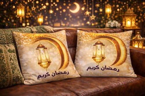 Generic - وسائد رمضان كريم مطبوعة، قطيفة وكتان، 45x45 سم، قطعتين، تصميم فوانيس وهلال