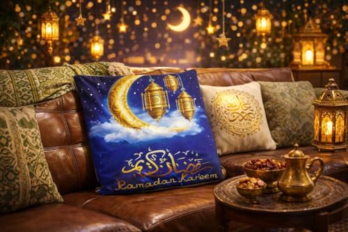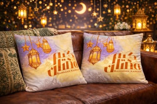 - محتوى المنتج: طقم مكون من قطعتين من الكوشن المزخرف بطباعة رمضان كريم مع فوانيس وأهلة وزخارف إسلامية تقليدية