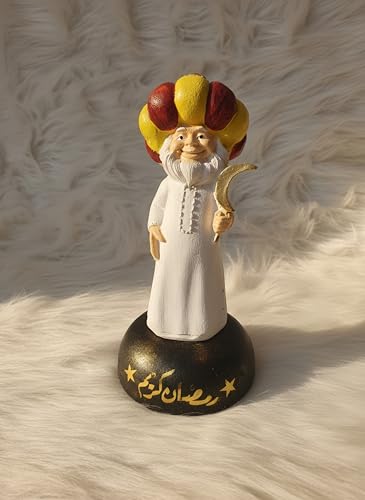 - تصميم رمضاني مميز: مجسم زينة على شكل شخصية تراثية بعمامة ملونة بالأحمر والأصفر وثوب أبيض، يحمل هلالاً ذهبياً يرمز لشهر رمضان المبارك