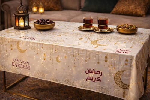- مفرش رمضاني مميز: مصنوع من خامة مشمع عالية الجودة بتصميم رمضاني مبهج يضم أشكال الهلال والفوانيس والنجوم مع عبارة رمضان كريم باللغتين العربية والإنجليزية