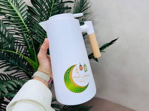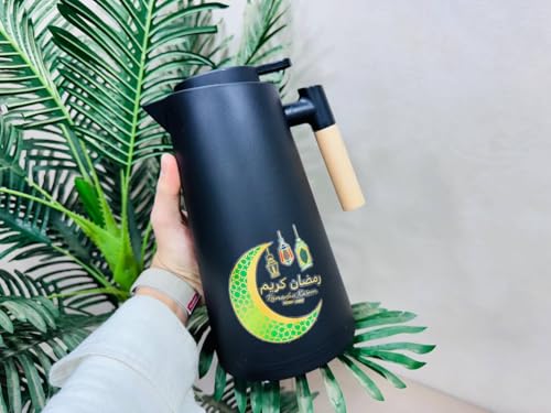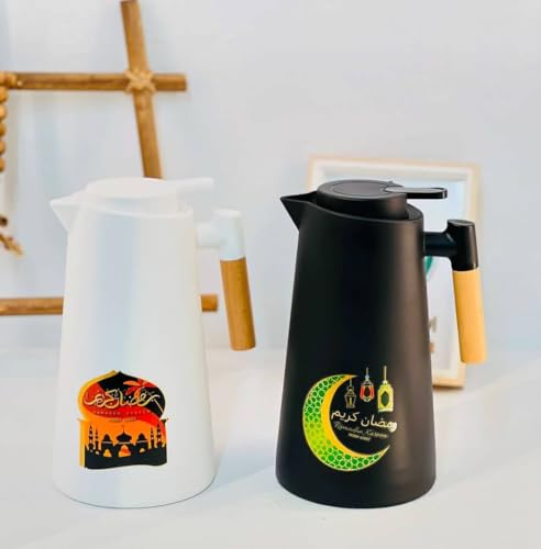 Generic - إبريق رمضان كريم معزول حراريًا للمشروبات الساخنة والباردة مع مقبض خشبي، أسود وأبيض، 1000 مل