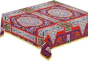 Generic - مفرش ترابيزة بتصميم خيامي لرمضان مصنوع من مزيج القطن مع طرف مزين بلون اصفر مقاس 1.5 × 1.5 مت