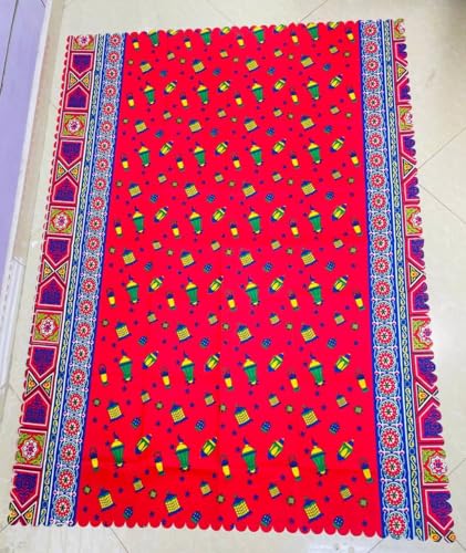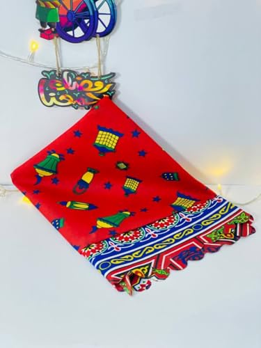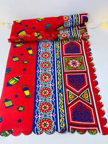 - التصميم الرمضاني: مفرش بطبعة الخيامية التقليدية بخلفية حمراء زاهية مزينة بفوانيس رمضانية ملونة وزخارف هندسية على الحواف