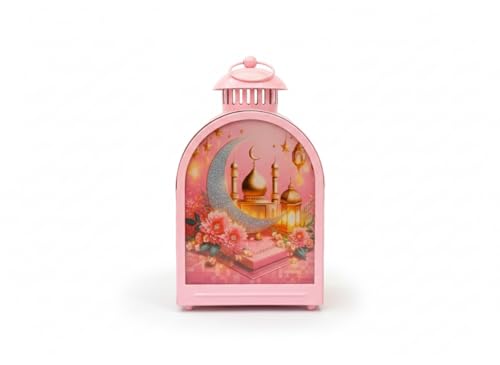 Generic - فانوس رمضاني بتصميم عش العصفور، زجاج مطبوع، لون وردي، حجم كبير 27 سم، بزخارف القمر والمسجد والزهور