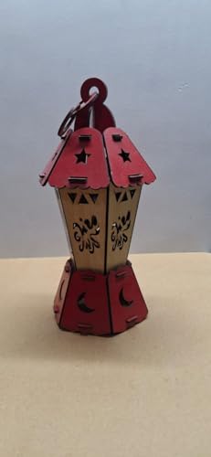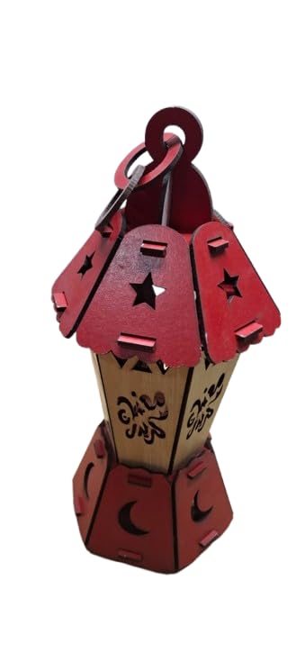 Generic - فانوس رمضان خشبي سداسي ملون 25 سم بوحدة اضاءة وصوت لون (شكل2 لون احمر)
