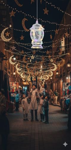 - إضاءة ملونة: يتميز بإضاءة متعددة الألوان تضفي جواً احتفالياً دافئاً ومبهجاً لديكور منزلك الإسلامي