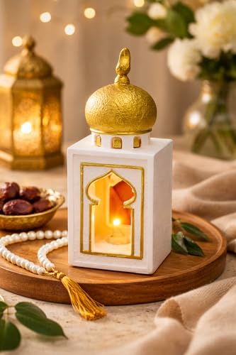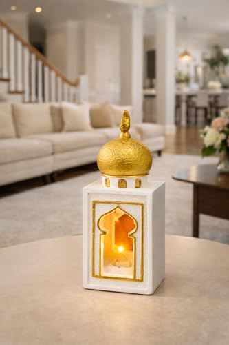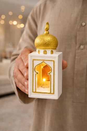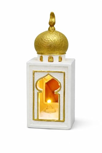 Generic - فانوس رمضان ديكور بإضاءة LED – تصميم إسلامي بقبة ذهبية فاخرة – فانوس طاولة أبيض × ذهبي للمنزل وركن الصلاة – يعمل بالبطارية – هدية رمضانية مميزة