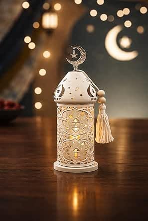 - تصميم إسلامي أنيق: فانوس رمضاني بتصميم تقليدي مزخرف باللون الأبيض والذهبي مع هلال في الأعلى وشرابة زينة جانبية لإضفاء لمسة احتفالية مميزة