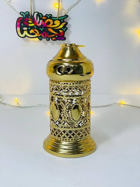 Generic - فانوس رمضان معدني ذهبي مفرغ بإضاءة LED ملونة مع زخارف هلال ونجمة، 15 سم