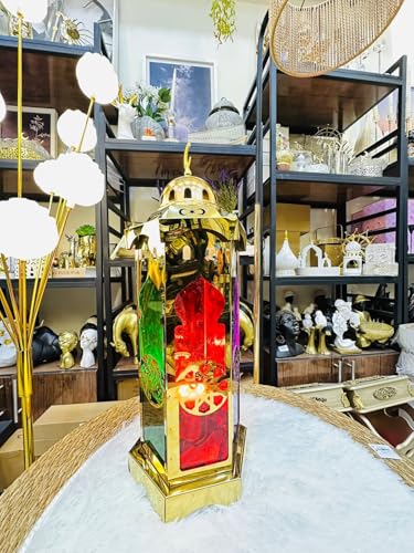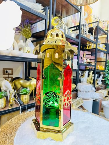 Generic - فانوس رمضاني ذهبي فاخر بزجاج ملون أخضر وأحمر، تصميم إسلامي تقليدي مع قبة وهلال، ديكور منزلي مميز