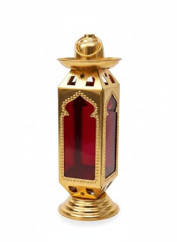 LC - فانوس رمضان بزجاج أحمر، مصباح معدني تقليدي لديكور المنزل بتصميم عربي إسلامي، ذهبي