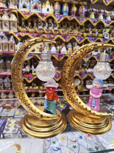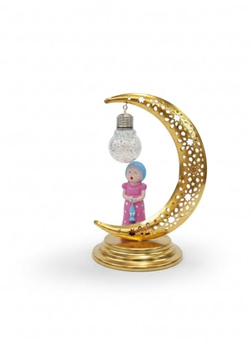 Generic - فانوس رمضاني بتصميم هلال ذهبي، معدن استانلس ستيل، مع إضاءة LED وشخصية بورسلين، ديكور إسلامي