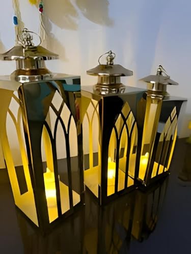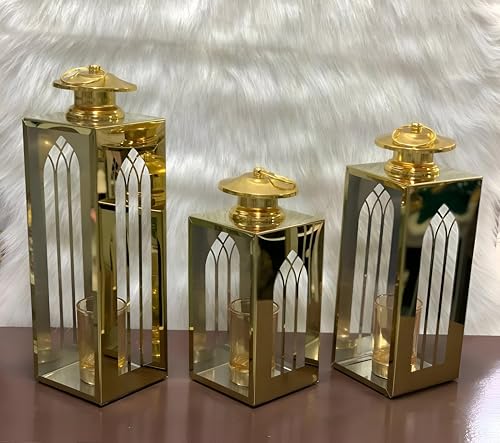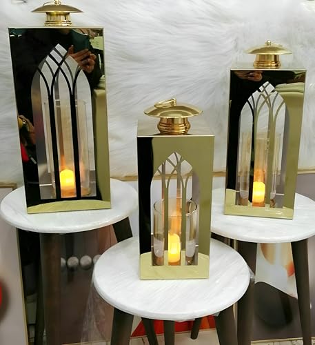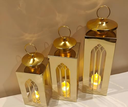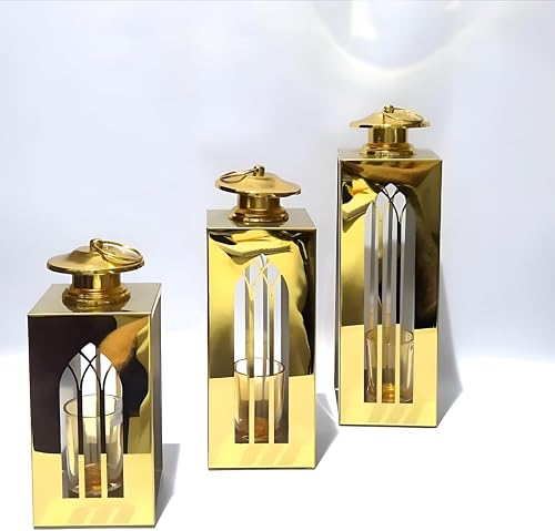 Generic - طقم فانوس رمضان ذهبي أنيق للمنزل بمقاسات مختلفة لإضفاء جو رمضان دافئ واحتفالي - مجموعة من 3 قطع