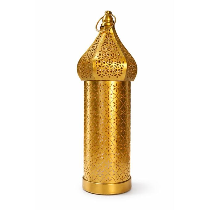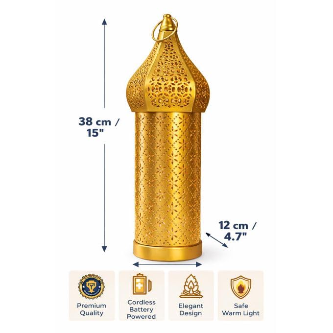Generic - فانوس رمضان LED معدني ذهبي بتصميم هرمي أرابيسك إسلامي، 38 سم، إضاءة دافئة، يعمل بالبطارية، ديكور داخلي للمنزل