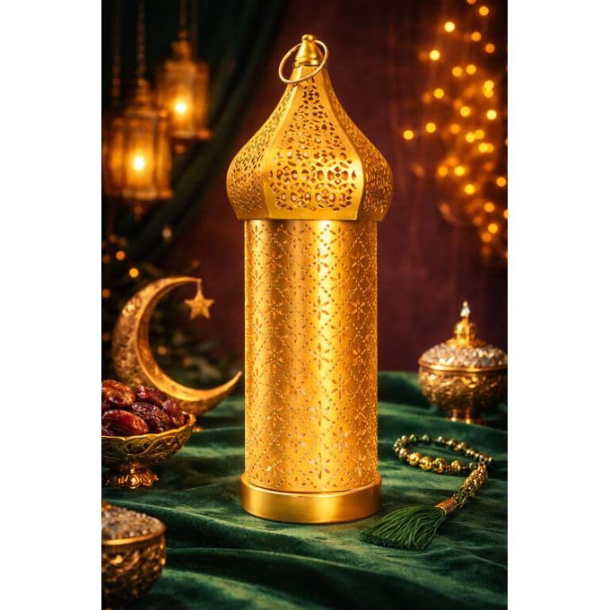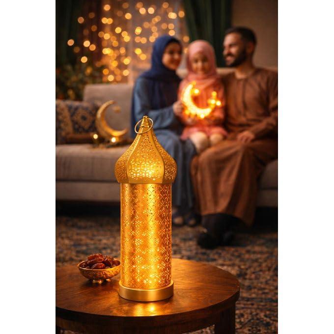 - الأبعاد المثالية: يبلغ ارتفاع الفانوس 38 سم وقطر القاعدة 12 سم، حجم مناسب لوضعه على الطاولات أو الأرفف كقطعة ديكور بارزة في رمضان والمناسبات الإسلامية