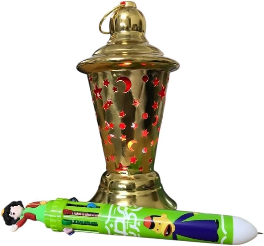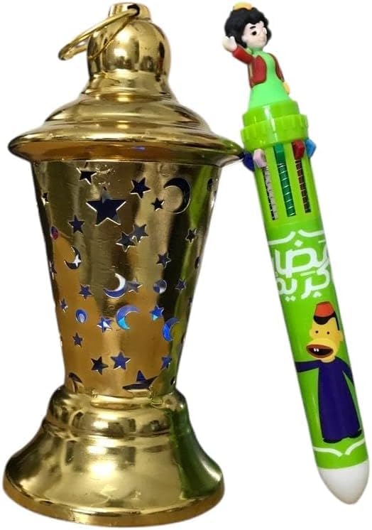 Generic - فانوس رمضان معدني بلون دهبى مزخرف بنجوم وأقمار مع قلم جاف 10 ألوان، ارتفاع 15 سم، تصميم رمضاني تقليدي